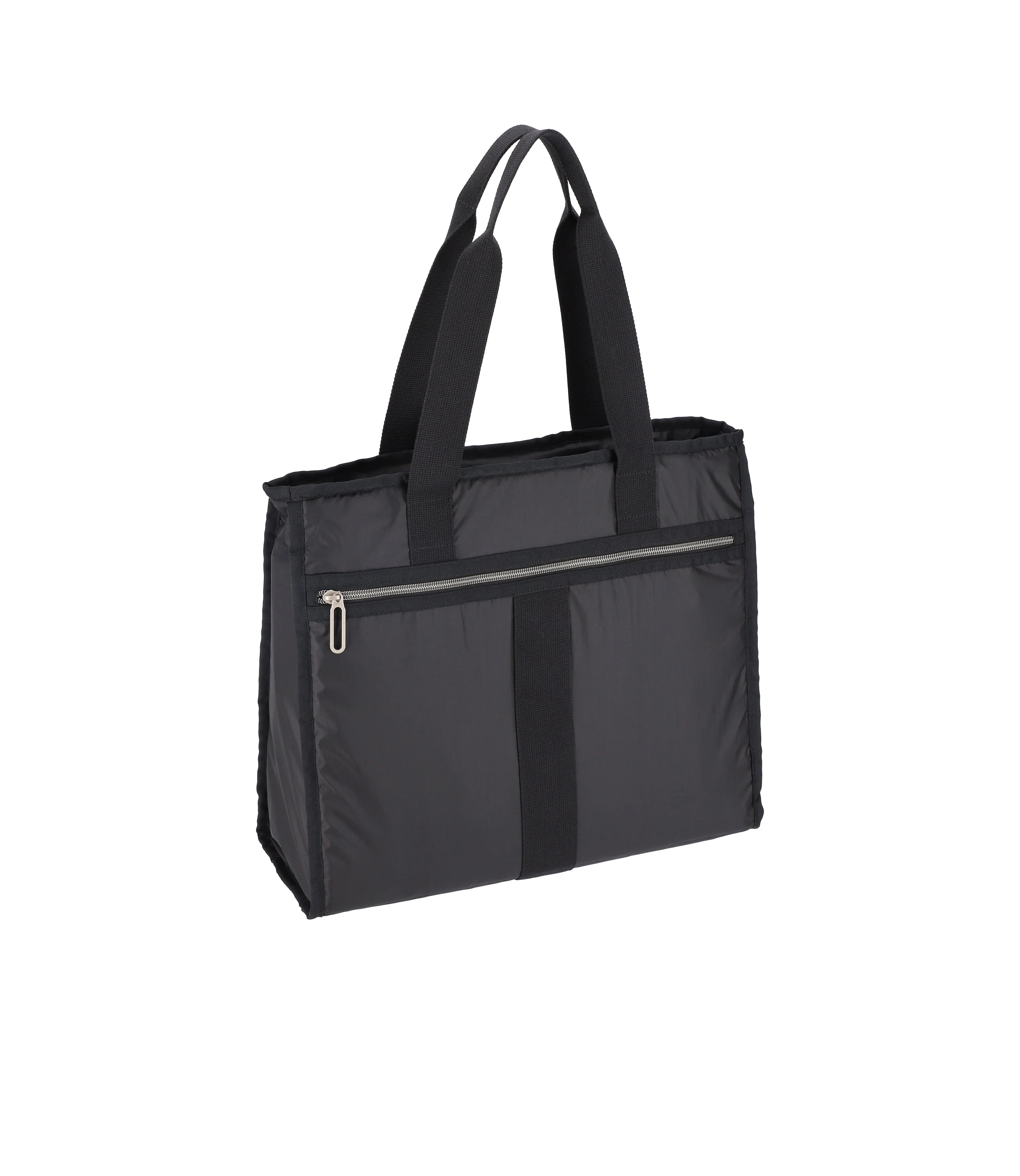 Stay organized with this True Black Essential Carryall tote bag, featuring a padded laptop pocket and multiple storage compartments. Pinched top handles provide a comfortable grip, while open and zippered pockets keep essentials easily accessible. Purchase now for a sleek, functional bag perfect for work or travel.